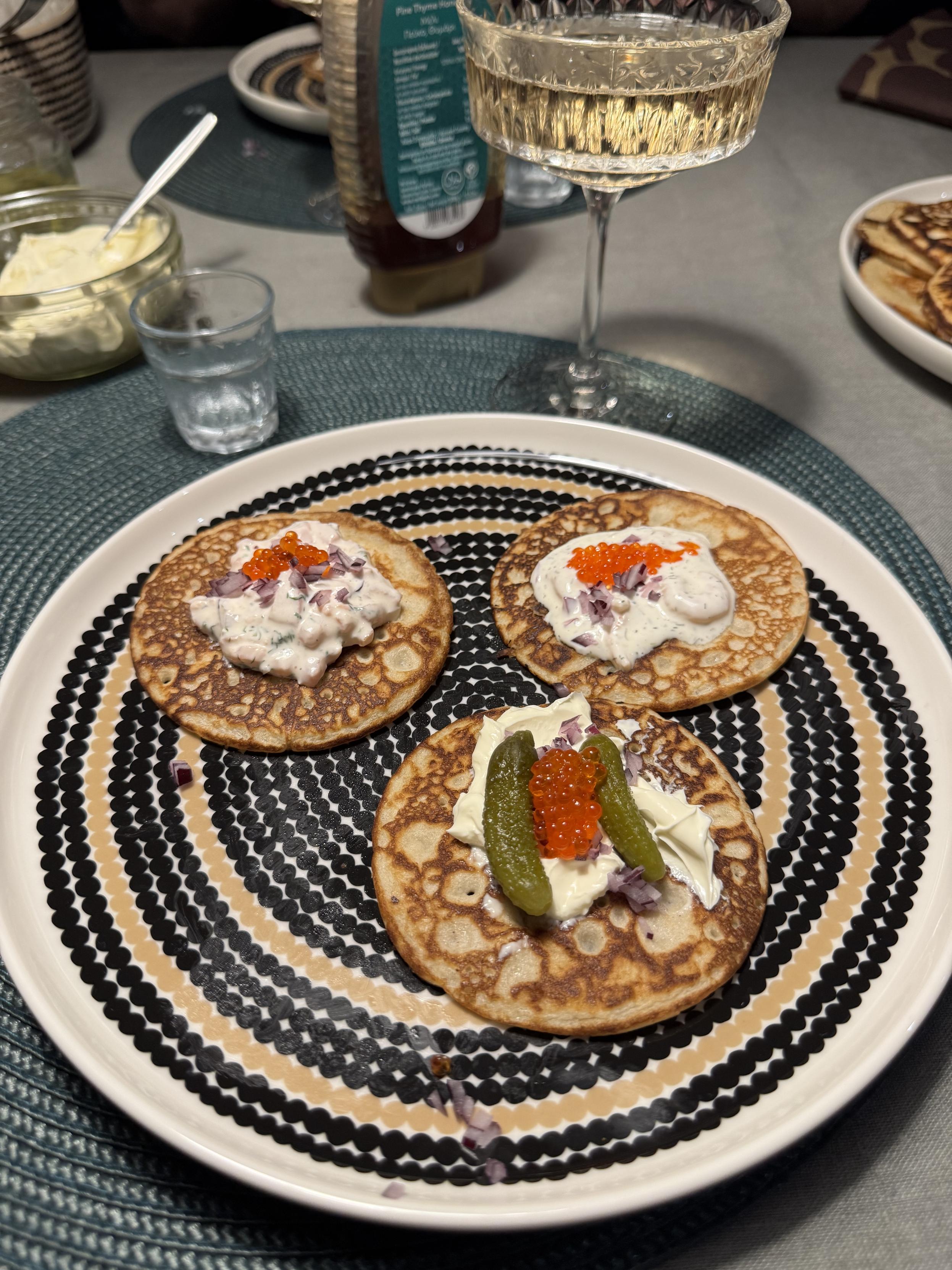Perinteisen nakkien ja pottusalaatin sijaan oli blinejä!