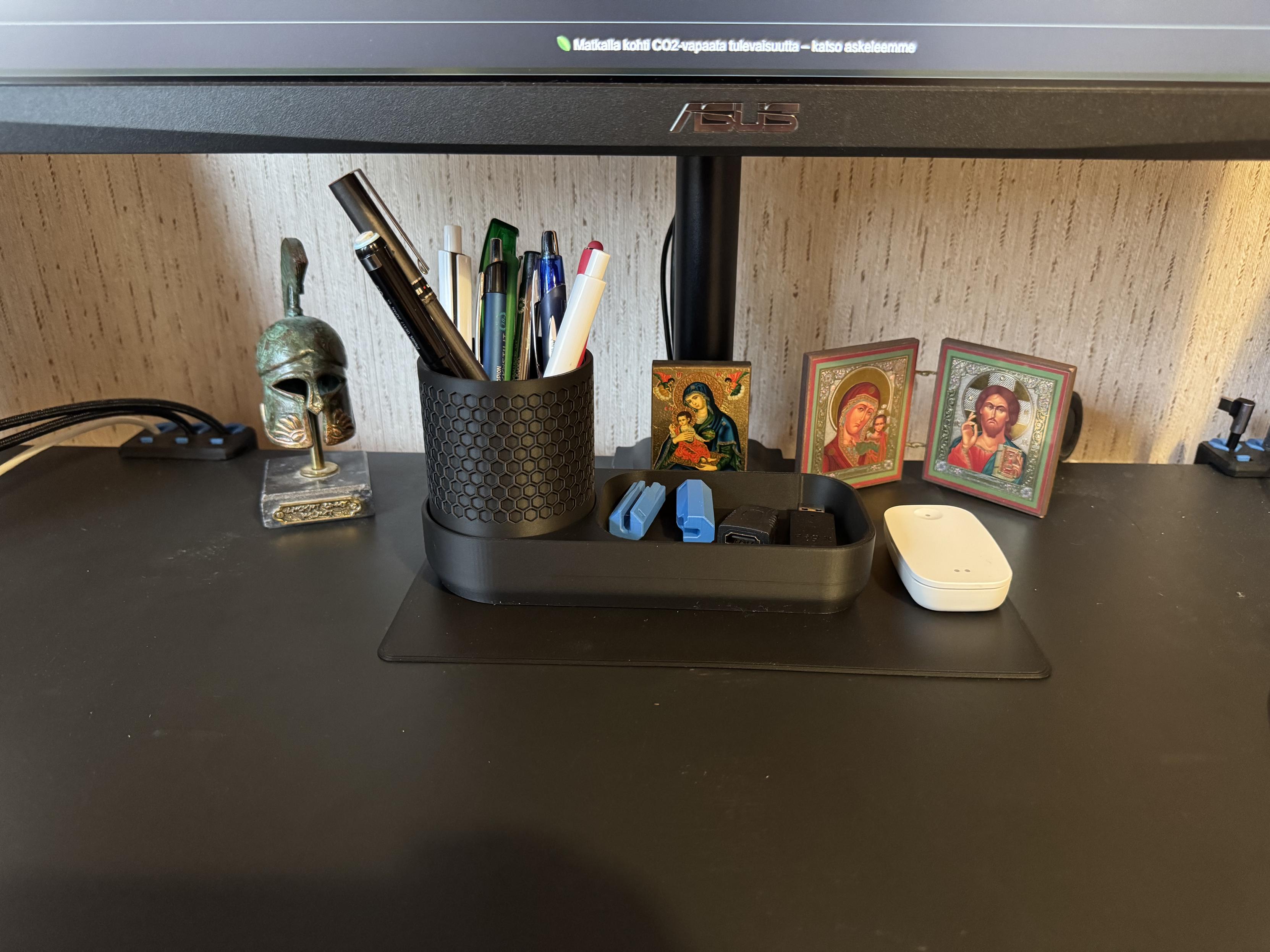 Tänään 3D-tulostin tulosteli jotain simppeliä, mutta mielestäni muutos parempaan. Tässä työpöydässä oli joku metallihärpäke, jonka tarkoitusta en nyt tiennyt. Siihen tulostelin sitten mattamustalla tommoi päällysen.