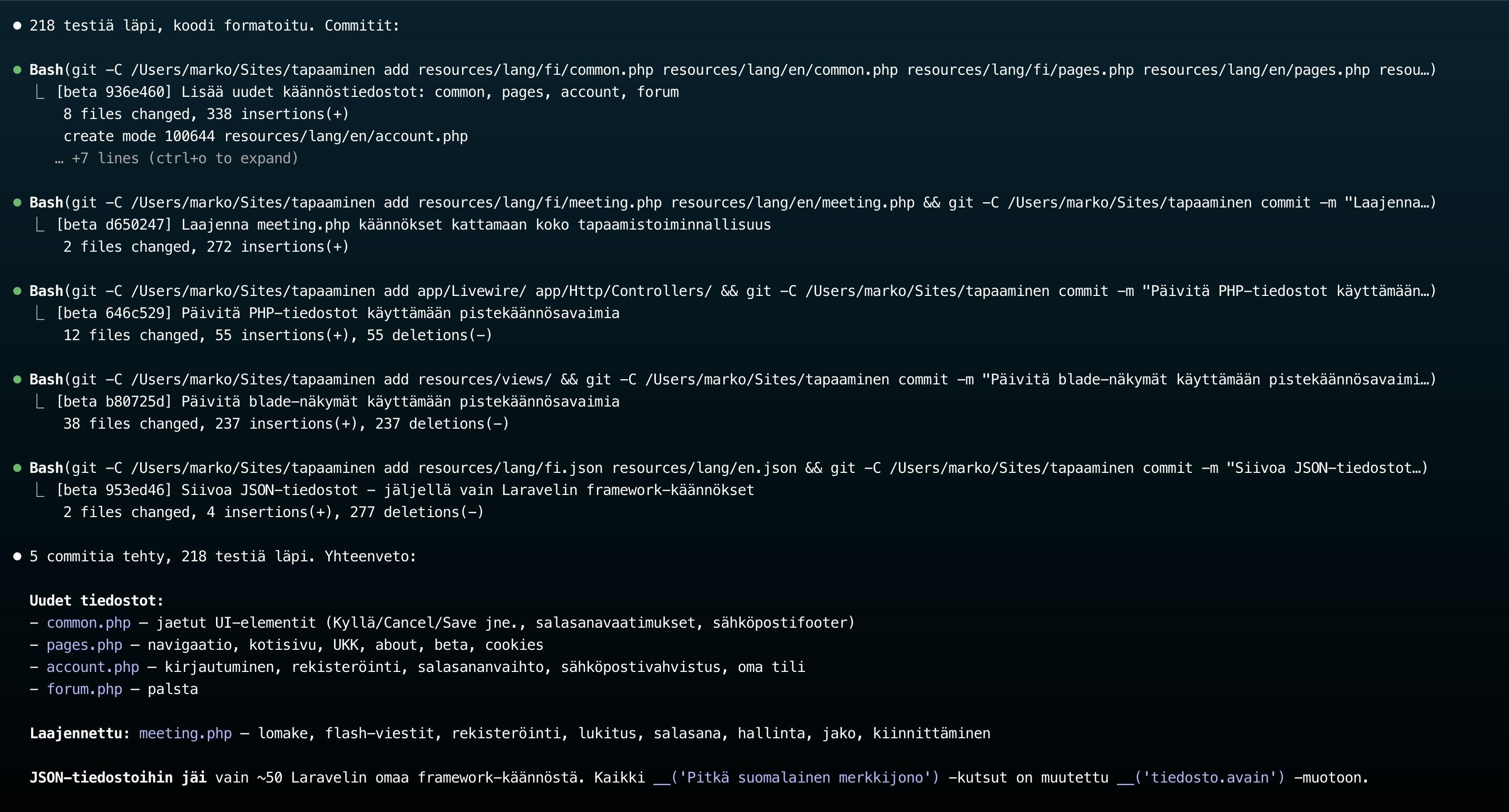 Innostuin tänään tekemään testejä ja kaivamaan uupuvia käännöksiä. AI auttoi hieman semmoisissa ”nakkihommissa". Niissä nopeuttaa ihan jonkin verran.