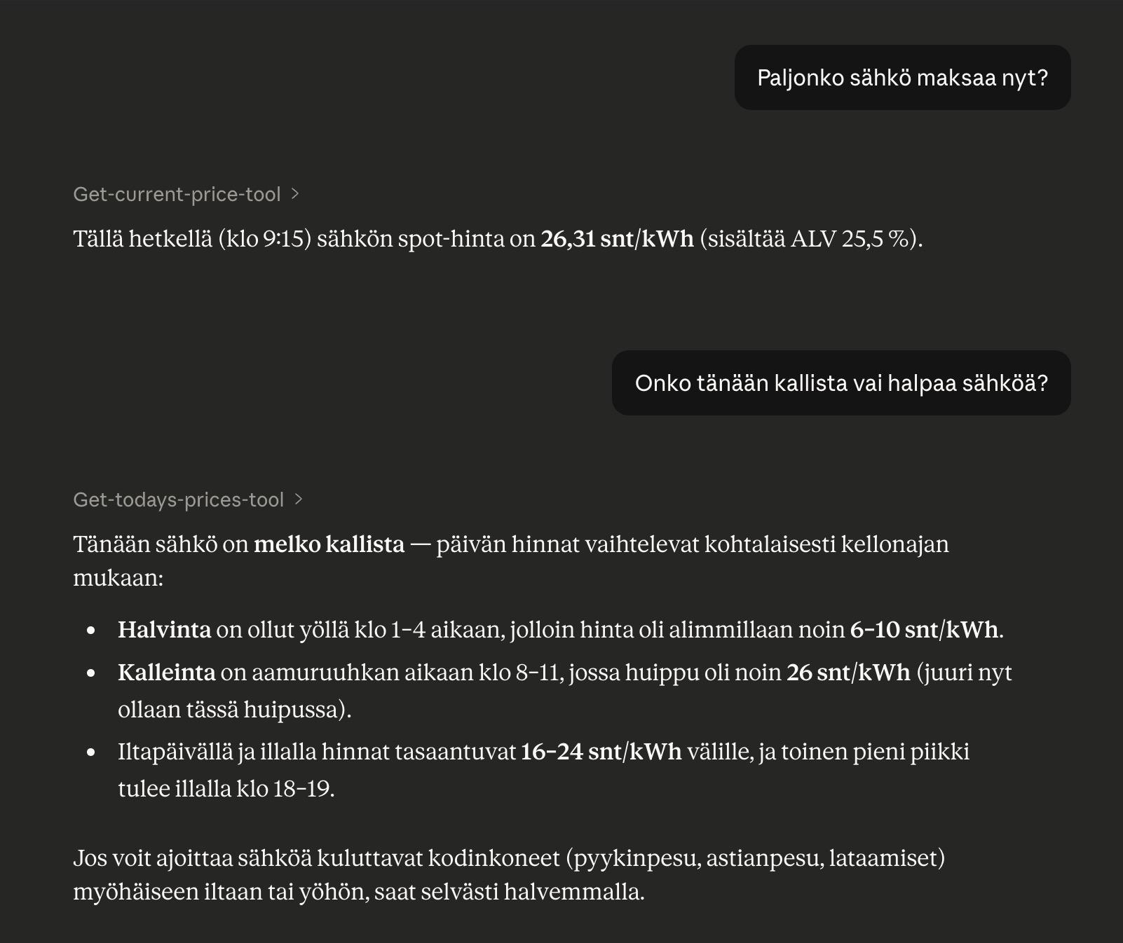 Tekaisin nimittäin MCP ”serverin" spottihinta.fi sivulle. Tämähän meinaa sitä, että tuon serverin antaa tekoälylle niin se voi käyttää sitä apuna ja hakea sähkön hintatietoa sieltä.