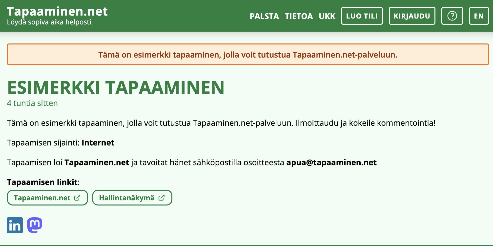 Onhan toi Tapaaminen.net suht käytetty alusta. viimeisen 30 päivän ajalta reilu 300 luotua tapaamista ja reilu 1400 ilmoittautumista.